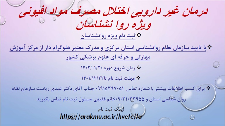 برگزاری دوره آموزشی و مهارتی اختلال مصرف مواد افیونی ویژه روان شناسان ۱۵ اسفند ۱۴۰۱ | ۰۸:۴۰ کد : ۳۲۸۶۷ اطلاعیه ارسال به دیگران نام شما ایمیل شما ایمیل دریافتکننده ارسال انصراف تعداد بازدید:۲۰۷۶۳ لینک ثبت نام