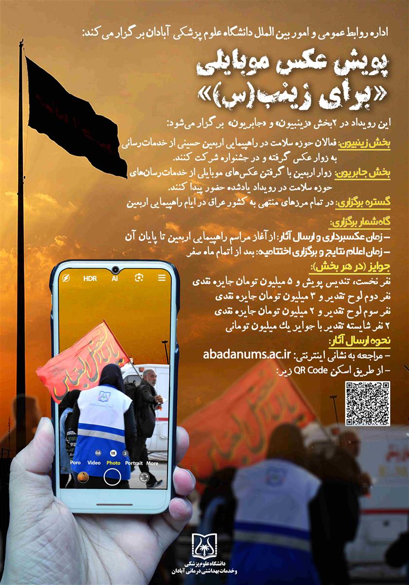 ضمن تسلیت ایام سوگواری شهادت سرور و سالار شهیدان حضرت اباعبدالله الحسین (ع) و یاران با وفای ایشان ، پوستر پویش عکس موبایلی با عنوان برای زینب (س) ویژه ایام راهپیمایی عظیم اربعین حسینی ، پیوست می باشد