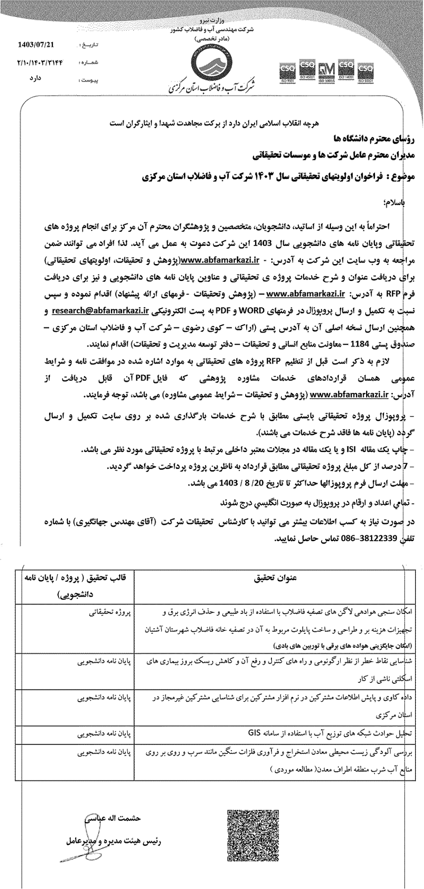 فراخوان اولویتهای تحقیقاتی شرکت آب و فاضلاب استان ۲۲ مهر ۱۴۰۳ | ۱۰:۳۵ کد : ۴۶۷۳۴ اطلاعیه ارسال به دیگران نام شما ایمیل شما ایمیل دریافتکننده ارسال انصراف تعداد بازدید:۱۱۷۹۰ فراخوان اولویتهای تحقیقاتی سال ۱۴۰۳ شرکت آب و فاضلاب استان مرکزی