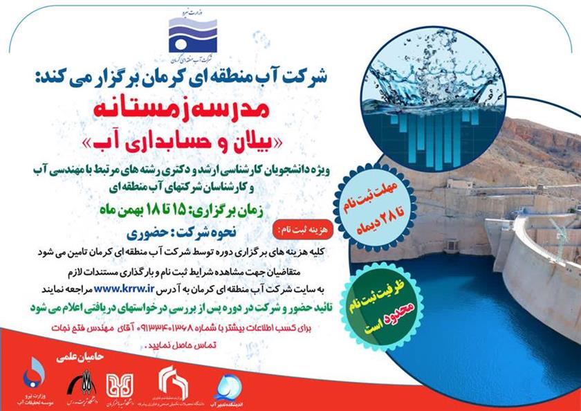 شرکت آب منطقه ای کرمان در نظر دارد مدرسه زمستانه "بیلان و حسابداری آب " را در بهمن ماه سال جاری در تاریخ ۱۵ لغایت ۱۸ بهمن ماه در کرمان به صورت رایگان برگزار نماید.