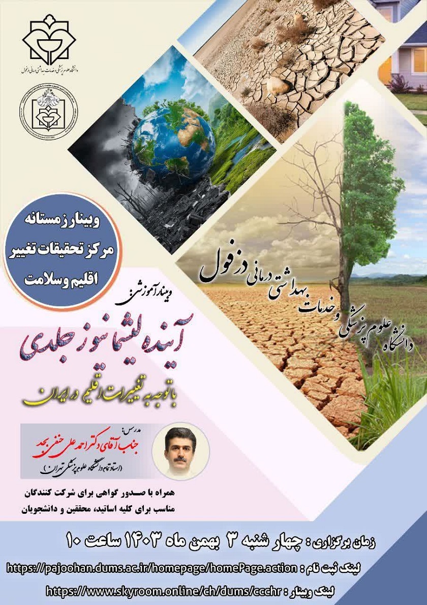 دانشگاه علوم پزشکی دزفول از کلیه علاقه مندان، اساتید، محققان و دانشجویان دعوت می نماید در دومین وبینار ملی فصلی از سری وبینارهای مرکز تحقیقات تغییر اقلیم و سلامت، با عنوان " آینده لیشمانیوز جلدی با توجه به تغییرات اقلیم در ایران " شرکت نمایند.