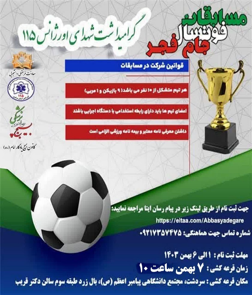 کانون بسیج یادگار امام (ره) مسابقات فوتسال جام فجر " گرامیداشت شهدای اورژانس 115 "  را برگزار می نماید.