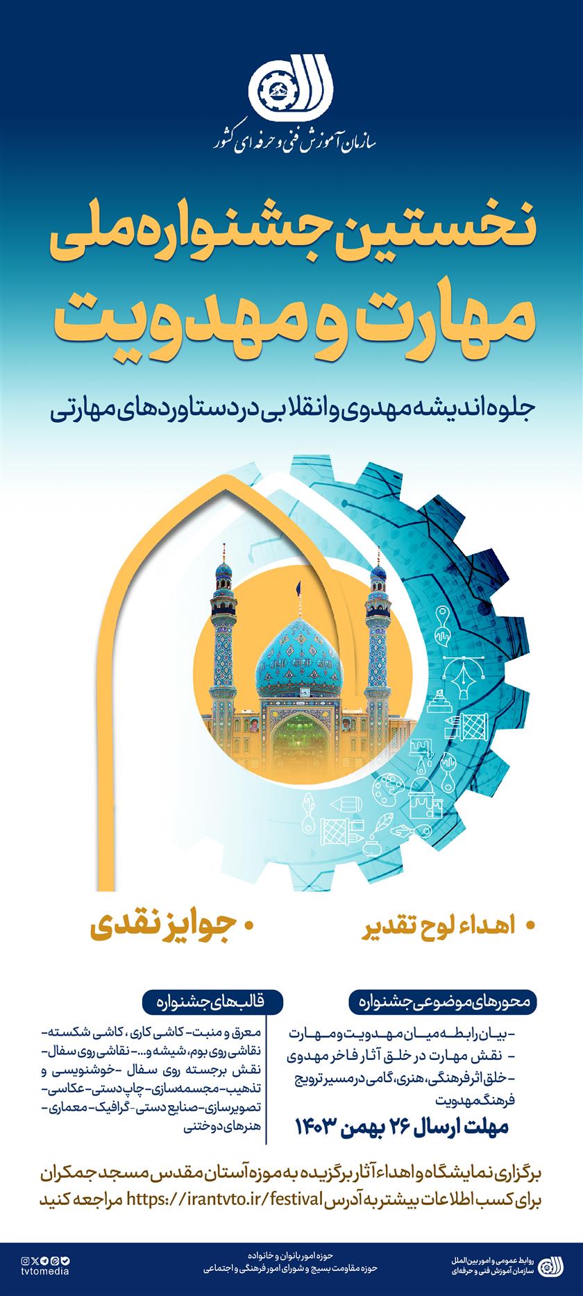 بنا بر اعلام اداره کل آموزش فنی و حرفه ای استان مرکزی ، جشنواره مهارت و مهدویت ، کاری از حوزه امور بانوان و خانواده سازمان آموزش فنی و حرفه ای کشور به مناسبت نیمه شعبان، به شرح زیر ، برگزار می گردد.