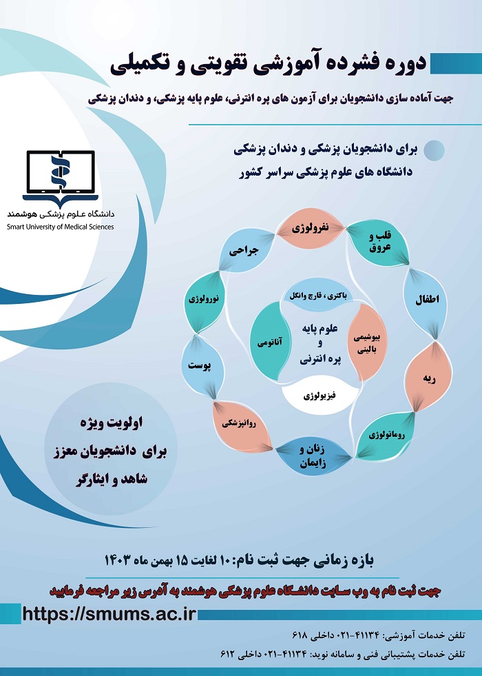به اطلاع کلیه دانشجویان رشته های دکتری عمومی پزشکی و دندان پزشکی دانشگاه علوم پزشکی می رساند، دانشگاه علوم پزشکی هوشمند، "دوره فشرده آموزشی تقویتی - تکمیلی" جهت آماده سازی دانشجویان برای آزمون های علوم پایه پزشکی، دندان پزشکی و پره انترنی را برگزار می نماید. پوستر و فایل فراخوان به پیوست می باشد.