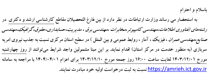 فراخوان مرحله سوم جذب نیروی امریه سربازی در وزارت ارتباطات و فناوری اطلاعات در سال ۱۴۰۳
