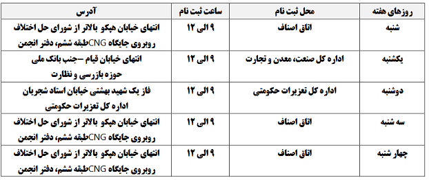 به اطلاع می رساند بر اساس اعلام فرمانداری شهرستان اراک، در خصوص از دسترس خارج شدن سامانه عضویت انجمن حمایت از حقوق مصرف کنندگان، ثبت نام متقاضیان عضویت با در دست داشتن کپی شناسنامه، کپی کارت ملی و یک قطعه عکس به صورت حضوری در مکان های ذیل صورت می پذیرد.
