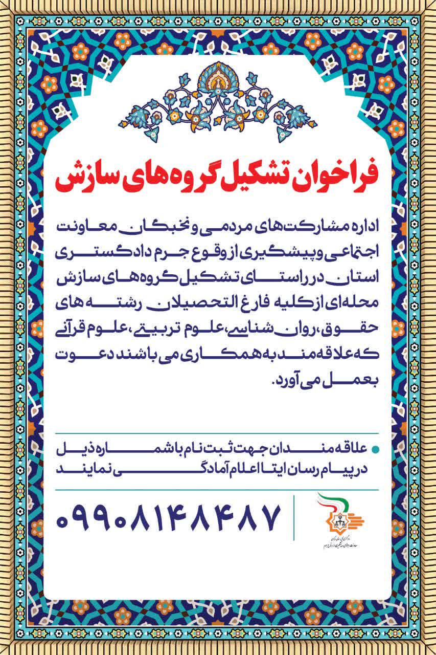 به اطلاع می رساند، معاون اجتماعی و پیشگیری از وقوع جرم دادگستری کل استان مرکزی، در راستای اجرای برنامه تشکیل و راه اندازی گروه های سازش محله ای و آسیب شناسی محلات حاشیه نشین و بافت های ناکارآمد، جهت عضویت در گروه های سازش محله ای، به شرح ذیل اعلام فراخوان نموده است.