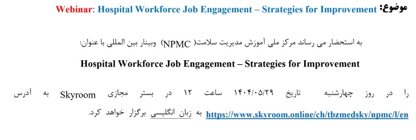 وبینار آموزشی بین المللی Hospital Workforce Job Engagement – Strategies for Improvement ۲۹ مرداد ۱۴۰۴ | ۱۰:۰۱ کد : ۵۳۹۲۵ اطلاعیه ارسال به دیگران نام شما ایمیل شما ایمیل دریافتکننده ارسال انصراف تعداد بازدید:۲۴۱۵ وبینار آموزشی بین المللی Hospital Workforce Job Engagement – Strategies for Improvement
