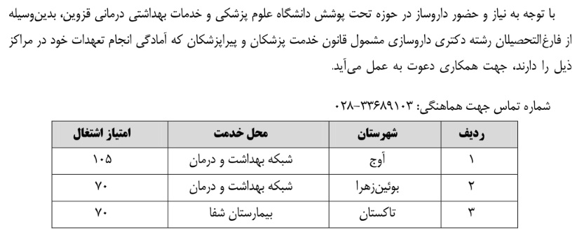 جذب نیروی داروساز مشمول قانون خدمت ۲۵ آذر ۱۴۰۴ | ۰۹:۰۰ کد : ۵۷۰۵۷ اطلاعیه ارسال به دیگران نام شما ایمیل شما ایمیل دریافتکننده ارسال انصراف تعداد بازدید:۱۷۶۹ جذب نیروی داروساز مشمول قانون خدمت در دانشگاه علوم پزشکی قزوین