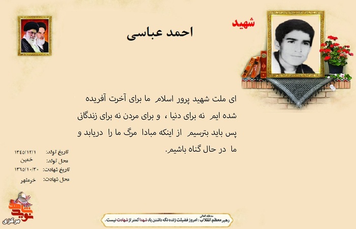 فرازی از وصیت نامه شهدا ۱۳ دی ۱۴۰۴ | ۱۰:۰۱ کد : ۵۷۴۶۹ اطلاعیه ارسال به دیگران نام شما ایمیل شما ایمیل دریافتکننده ارسال انصراف تعداد بازدید:۱۱۴ فرازی از وصیت نامه شهدا فرازی از وصیت نامه شهید بزرگوار احمد عباسی :